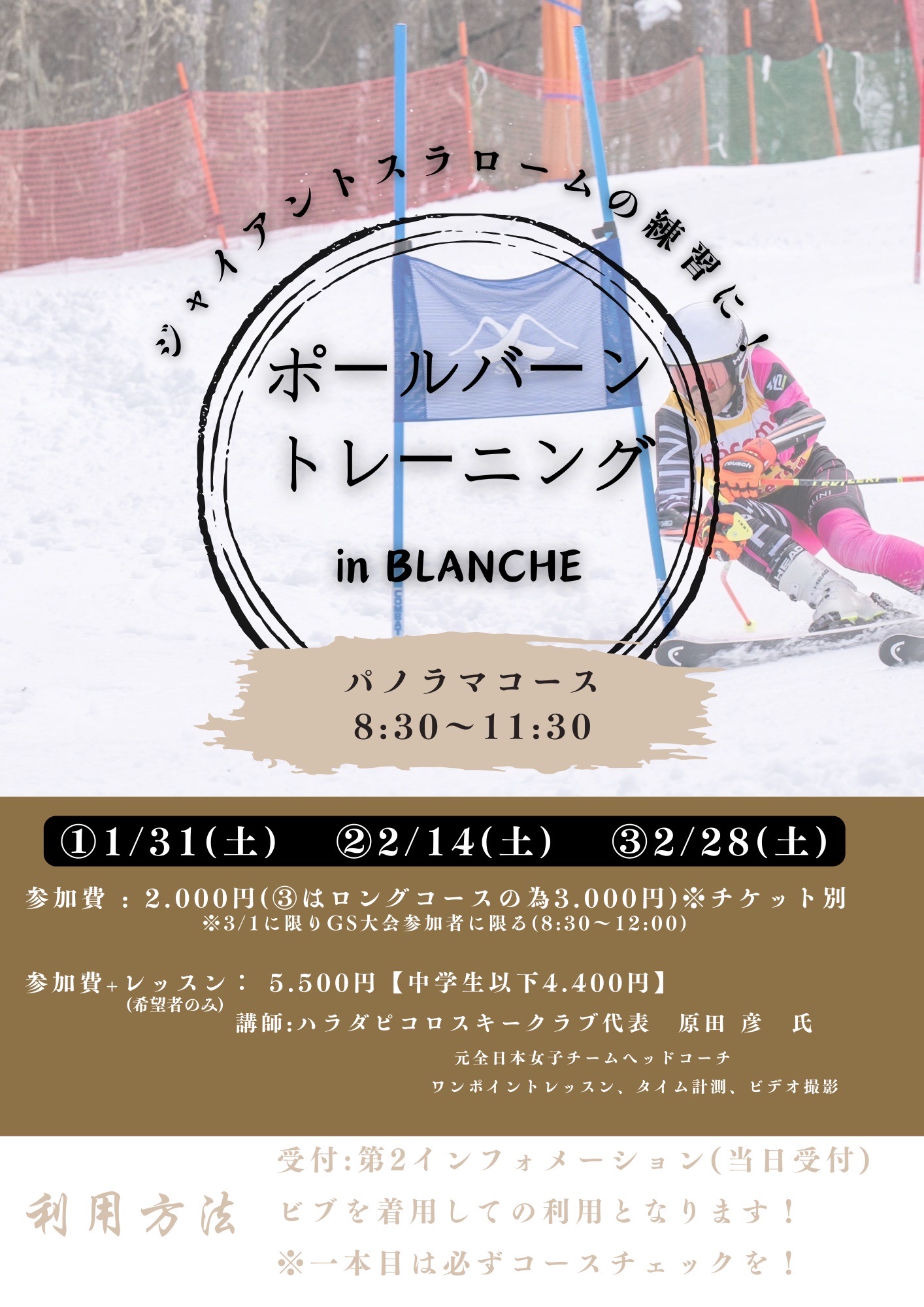 そんな方々にお知らせです!スキー場にてGS(ジャイアントスラローム)のセットを行い、参加者に滑ってもらうという企画。3/1開催のブランシュGS大会の練習にもどうぞご利用ください!