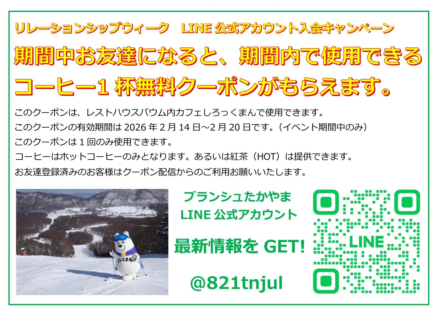 この期間中ブランシュ公式LINEでお友達登録をして頂くと、ゲレンデ中腹レストハウスバウム内の「カフェしろっくまん」で使えるコーヒー無料券を1枚プレゼント!